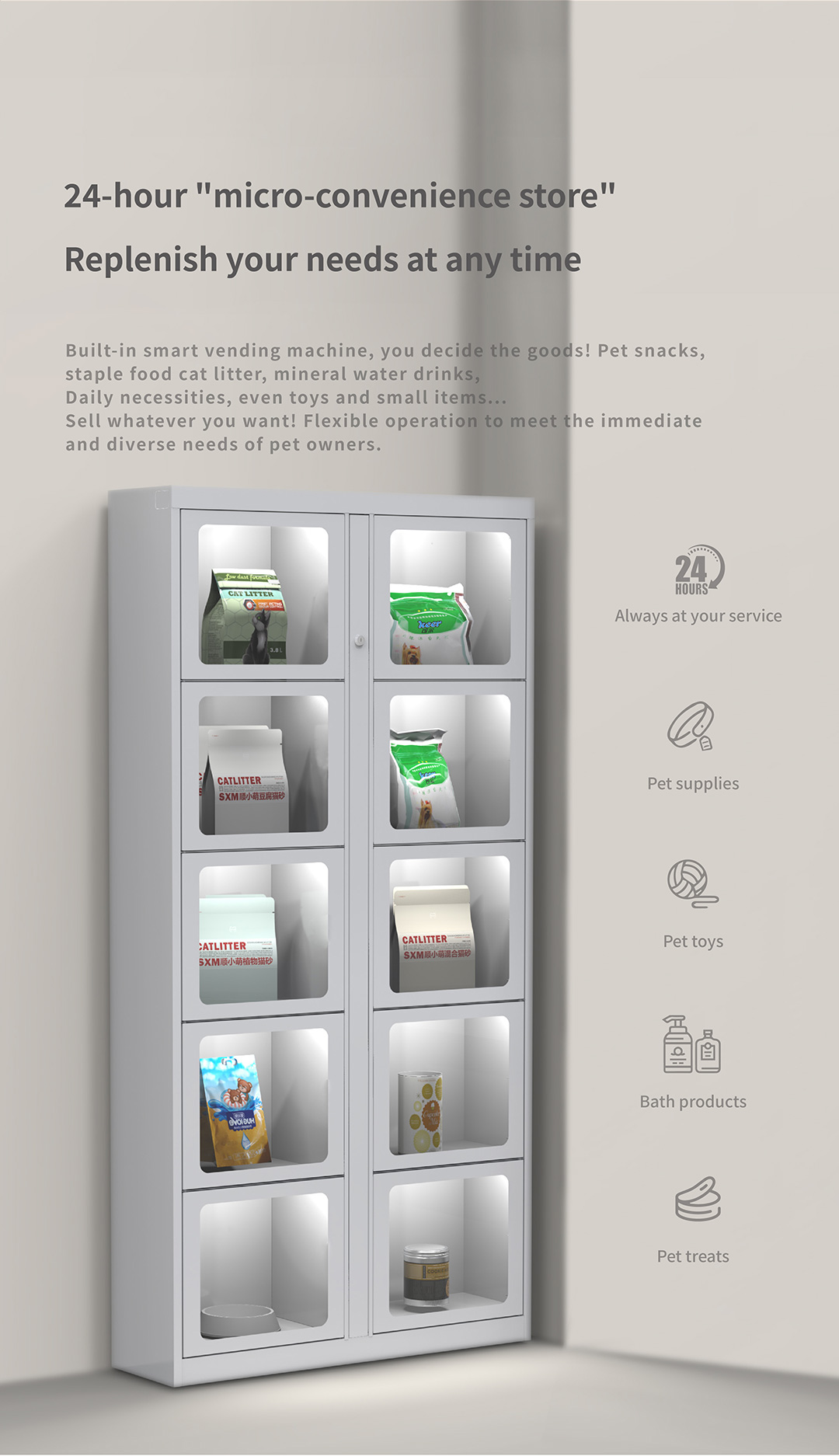 Built-in smart vending machine, you decide the goods! Pet snacks,staple food cat litter, mineral water drinks,Daily necessities,even toys and small items...Sell whatever you want! Flexible operation to meet the immediateand diverse needs of pet owners.