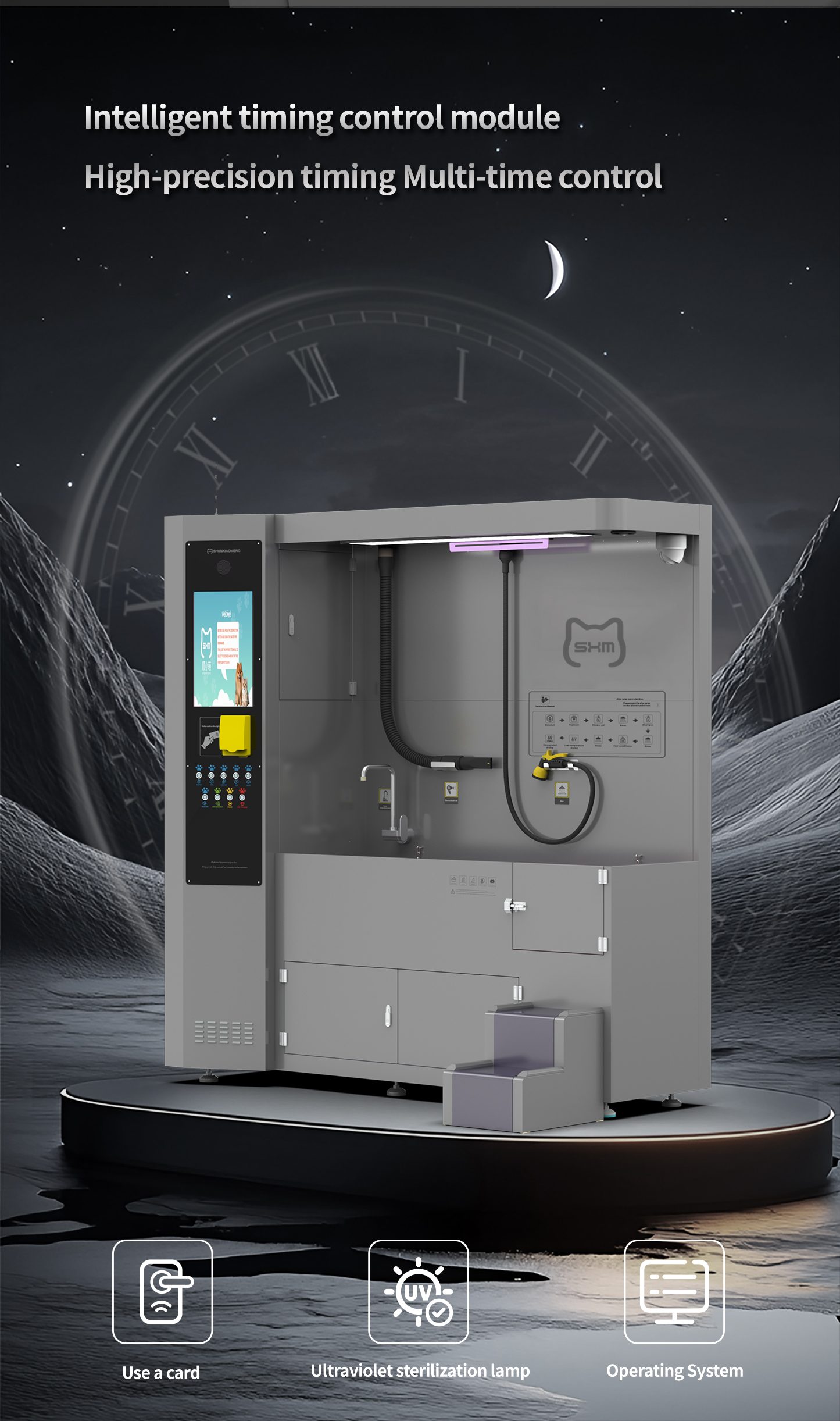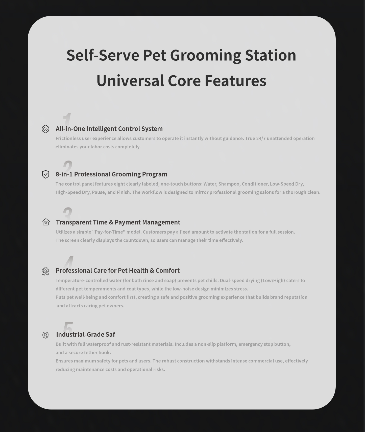 This open-style station features our core smart touchscreen, versatile card tap & pre-paid payment options, and a built-in security camera for remote monitoring. It delivers the same professional 8-in-1 wash & dry experience as premium models, but in a simple, cost-effective design. Perfect for start-ups or any location seeking a reliable, self-serv This open-style station features our core smart touchscreen, versatile card tap & pre-paid payment options, and a built-in security camera for remote monitoring. It delivers the same professional 8-in-1 wash & dry experience as premium models, but in a simple, cost-effective design. Perfect for start-ups or any location seeking a reliable, self-service solution with modern convenience and essential smart features. Get a professional operation started at an unbeatable value.ice solution with modern convenience and essential smart features. Get a professio